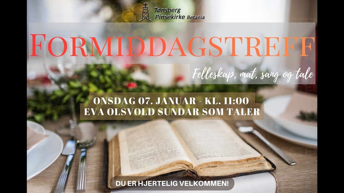 Velkommen til Formiddagstreff onsdag 07. januar - kl. 11.00. Eva Osvald Sundar som taler, det blir også sang og musikk. God tid til bevertning og sosialt samvær.